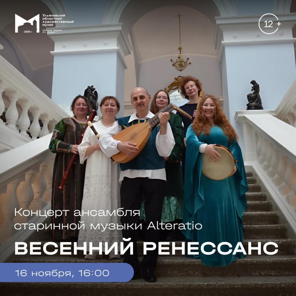 Зрители насладятся музыкальным искусством эпохи Возрождения в стенах Ульяновского областного художественного музея. Лучшие образцы итальянской, французской и английской музыки XV–XVI прозвучат в исполнении ансамбля Alteratio – уникального коллектива музыкантов, играющих на аутентичных музыкальных инструментах. Для посетителей на старинных инструментах будут играть Олег Киселев (ренессансная лютня); Любовь Скворцова (бубен), Екатерина Алаева (блок флейта-сопрано), Майя Козина (блок флейта-альт), Александра Куликова (блок флейта-тенор), Полина Леонтьева (блок флейта-бас). Руководитель ансамбля Олег Киселев, вокальные партии исполнит Любовь Скворцова.