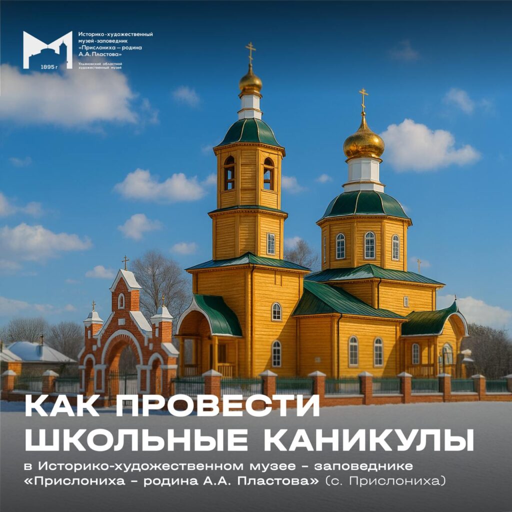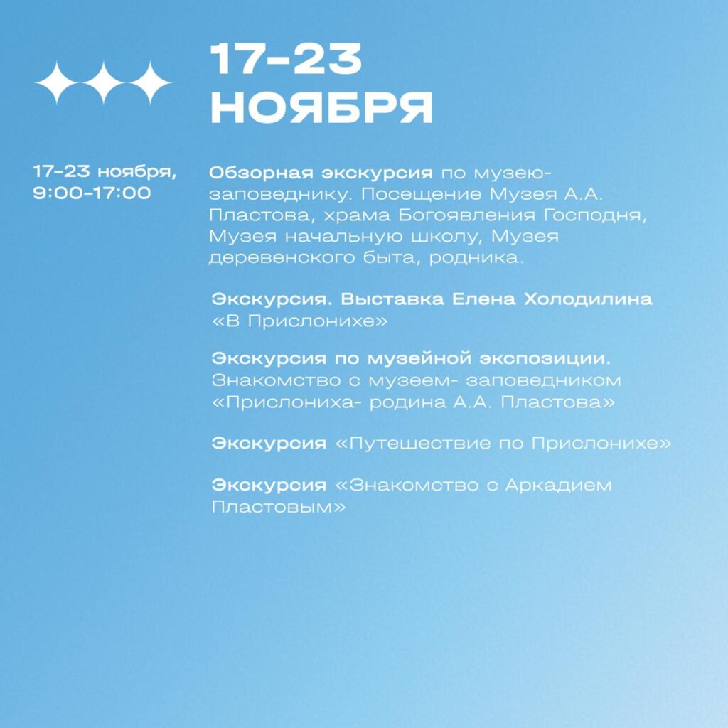 17 ноября – 23 ноября | Обзорная экскурсия по музею-заповеднику. Посещение Музея А.А. Пластова, храма Богоявления Господня, Музея начальную школу, Музея деревенского быта, родника. | Историко-художественный музей-заповедник «Прислониха – родина А.А. Пластова» с. Прислониха Ульяновская область, Карсунский район, с. Прислониха, ул. Советская, д.1а. Время работы музея: 9:00-17:00 Выходной: понедельник | 6+ Пушкинская карта |