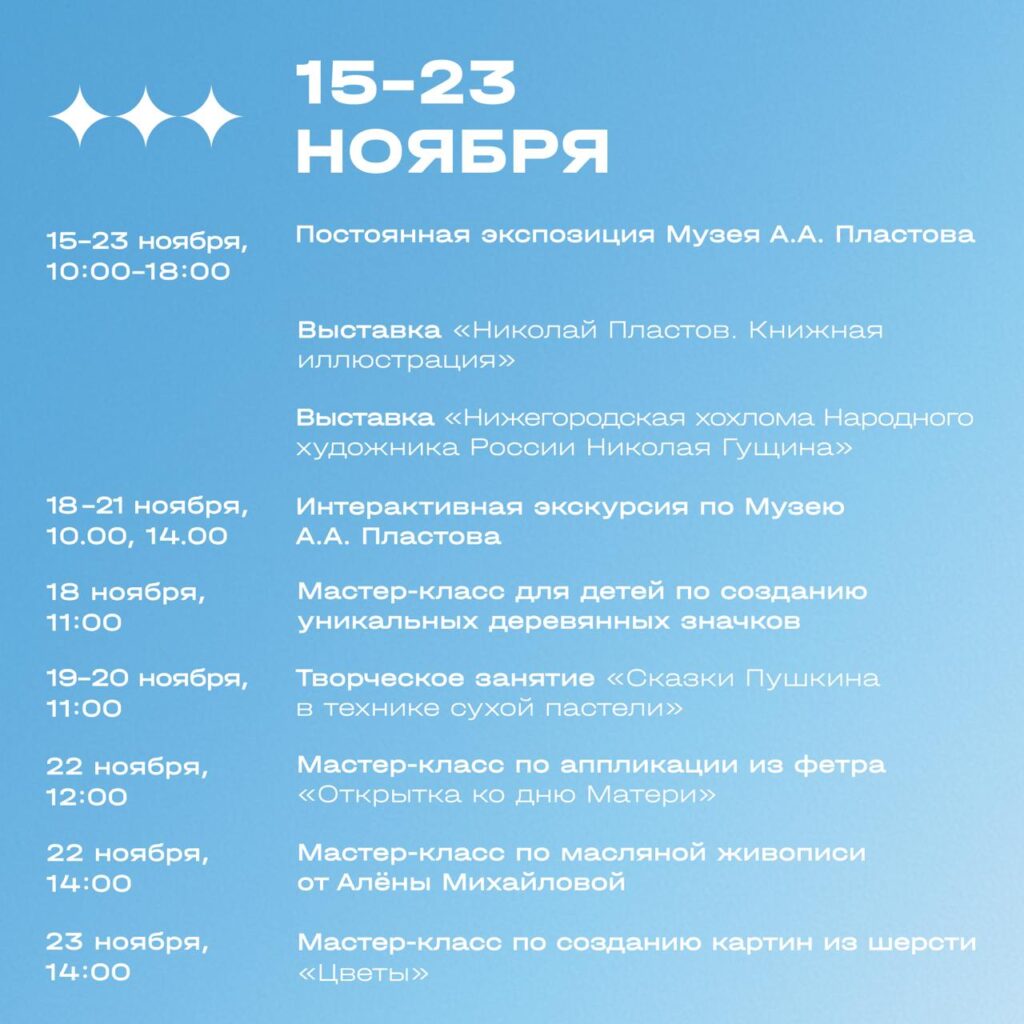 15 – 23 ноября | Выставка «Николай Пластов. Книжная иллюстрация» (по прейскуранту) | 10.00 – 18.00 (Касса работает до 17.30). Выходной – понедельник. т. 41-48-20. Музей А.А. Пластова (ул. Гончарова, 16, 1 этаж) 13 ноября «черный» четверг 12.00 – 20.00 (Касса работает до 19.30). | 0+ Пушкинская карта |