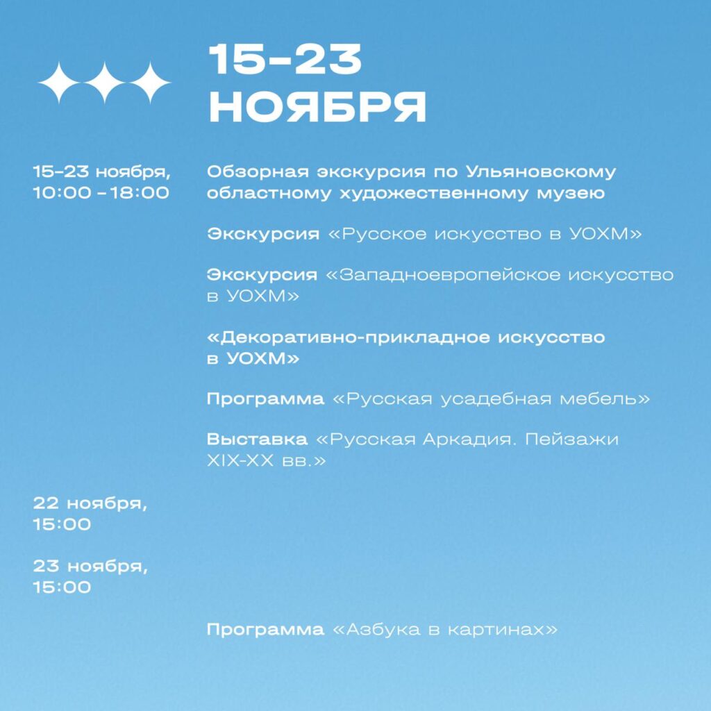 18 – 21 ноября | «Азбука в картинах» Программа ориентирована на детей младшего школьного возраста и направлена на знакомство с коллекцией Художественного музея. «Азбука в картинах» — это интерактивное путешествие по алфавиту, где каждая буква оживает через шедевры живописи. Дети не просто смотрят на картины — они их «читают», как увлекательную сказку, развивая воображение, речь и любовь к искусству. от 10 человек | ОГБУК «Ульяновский областной художественный музей», Бульвар «Новый Венец», ¾, 8 (8422)44-30-80, по заявкам | 6+ |