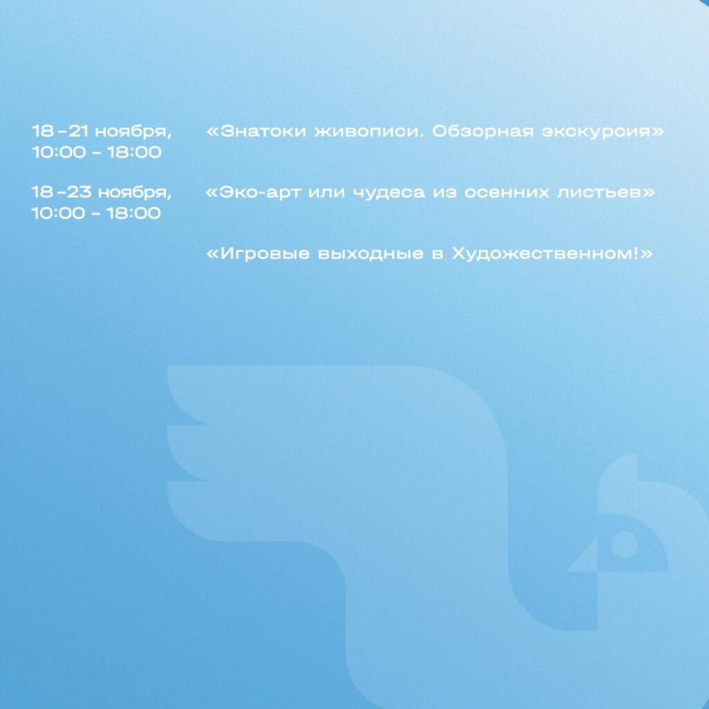 22 – 23 ноября | «Игровые выходные в Художественном!» Игровые выходные — это прекрасная возможность провести время с семьей и друзьями в атмосферном пространстве художественной галереи. Мы приглашаем всех на творческое и веселое мероприятие, которое сочетает в себе искусство, игры и креатив!