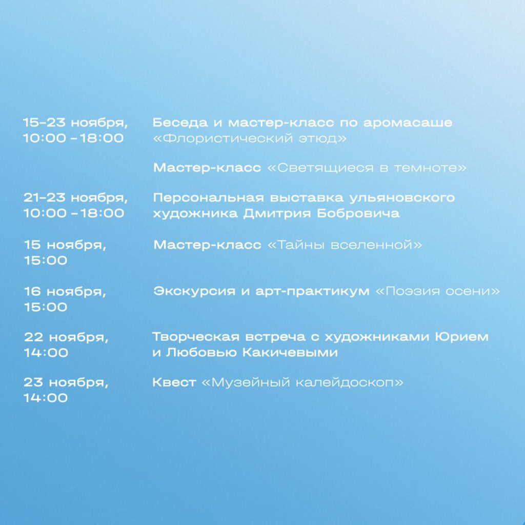 15 ноября | Мастер-класс «Тайны вселенной» Мастер-класс открывает перед своими гостями двери в мир тайн и загадок Вселенной, приглашая их отправиться в увлекательное путешествие сквозь пространство и время. Участники мероприятия не только обсудят захватывающую тему межзвездных полетов, но и познакомятся с уникальной программой, представляющей собой созвездие шедевров мирового искусства, вдохновленных космосом. Кульминацией станет мастер-класс по созданию эксклюзивного брелока «Тайны Вселенной». Этот творческий процесс позволит каждому почувствовать себя создателем собственной галактики, воплощая безграничную красоту звездного неба в изящном аксессуаре. Участники раскроют свой художественный потенциал, создавая волшебные стеклянные миниатюры, наполненные красками и блестками, имитирующими мерцание далеких звезд. Не упустите шанс погрузиться в мир искусства и фантазии, создав свой уникальный кусочек Вселенной! Количество мест ограничено, поэтому желающим прикоснуться к тайнам космоса стоит поторопиться и записаться по телефону: +7 (8422) 42-05-76. Стоимость: 500 руб.