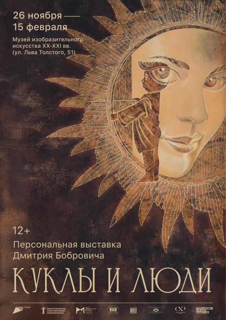 26 ноября в 16:00 в Музее изобразительного искусства XX-XXI вв. (ул. Льва Толстого,51) откроется персональная выставка известного художника театра Дмитрия Бобровича «Куклы и люди». Экспозиция включает более 100 произведений, среди которых: костюмы, эскизы и элементы сценографии к готовящемуся спектаклю «Лир» по пьесе Уильяма Шекспира Димитровградского драматического театра имени А.Н. Островского; серия иллюстраций Дмитрия Бобровича к книге «След Локи» ульяновского автора О.Р. Самарцева; эскизы и фотографии к спектаклю «Цирк, или Кукольное представление на земле и под водой» по пьесе Даниила Хармса Театра кукол «Сказ» имени В. Машкова (г. Новокузнецк).