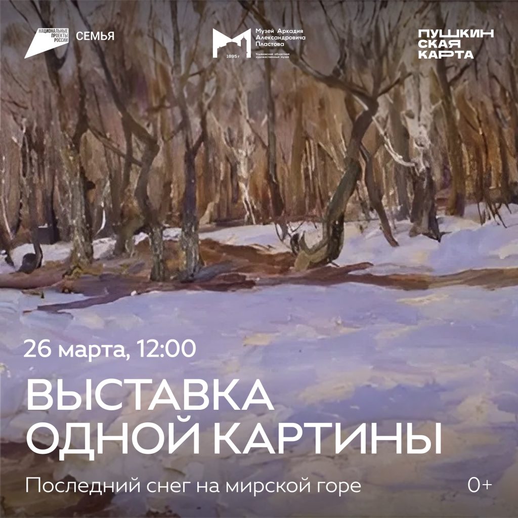 В рамках празднования 130-летия Ульяновского областного художественного музея в Музее А.А. Пластова организован цикл «Выставок одной картины», проводимых в «черные четверги» (вторая и четвертая неделя каждого месяца). Посетители смогут увидеть произведение Аркадия Пластова «Последний снег на Мирской горе» (1960-е гг.) из коллекции музея. Мирская гора — та самая возвышенность, что встречает путника слева при въезде в Прислониху с востока. Название её хранит память о двух мирских амбарах, где некогда берегли общественный семенной хлеб.