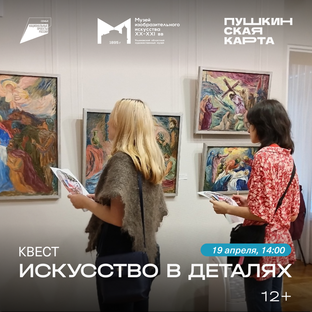 Посетители познакомятся с произведениями искусства XX-XXI веков, представленными в постоянной экспозиции и на выставках музея. Узнают о творческих объединениях начала ХХ века: «Союз русских художников», «Мир искусства», «Голубая роза», «Маковец», «Бубновый валет», «Супремус». В экспозиции – уникальные произведения Зинаиды Серебряковой, Бориса Кустодиева, Исаака Бродского, Ильи Машкова, Натальи Гончаровой, Михаила Ларионов, Аристарха Лентулова, Ольги Розановой, Сергея Герасимова, Александра Бубнова, Виктора Попкова и других художников XX века. После знакомства с экспозицией гости примут участие в увлекательном квесте «Искусство в деталях». Используя полученные знания, посетители должны найти произведения по фрагментам, изображенным на игровой карте.